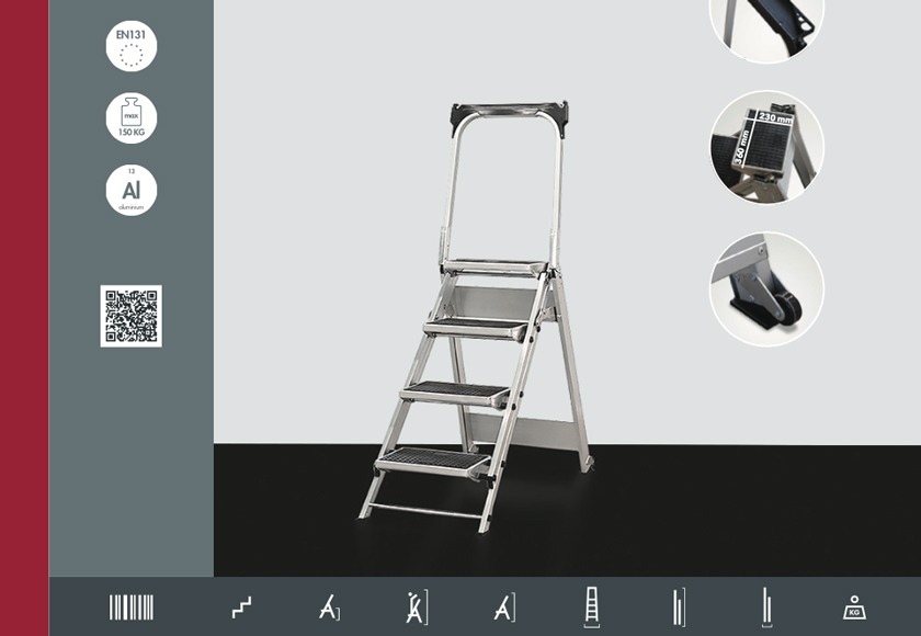 - Marches de grande dimension (230×360 mm) avec tapis antidérapants y porte-outils
