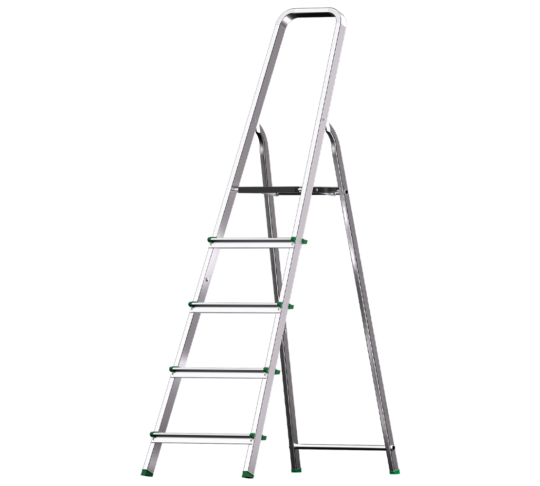 - Plataforma lacada sem superfícies cortantes, degraus estriados antiderrapantes com duplo rebite e arco de segurança
